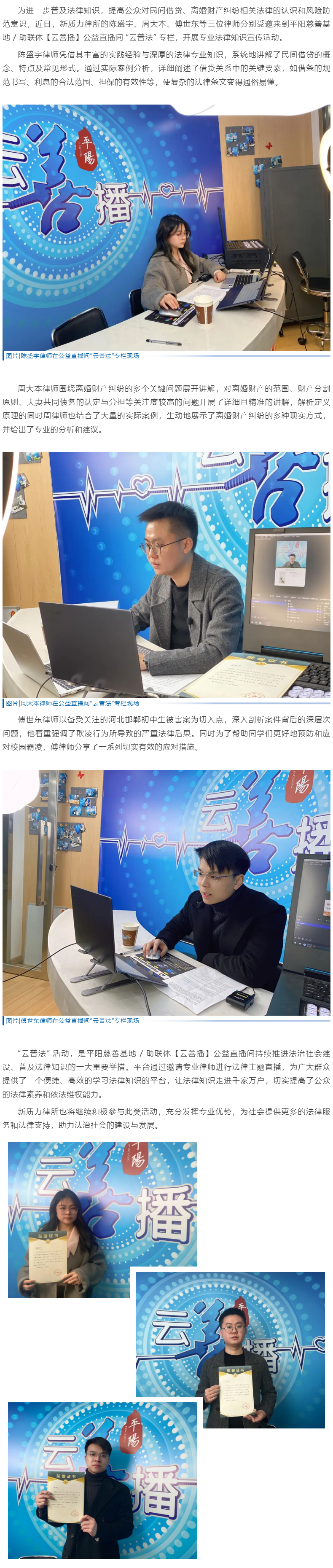 新质力所陈盛宇律师、周大本律师、傅世东律师先后受邀为“云善播” 开展普法公益行活动