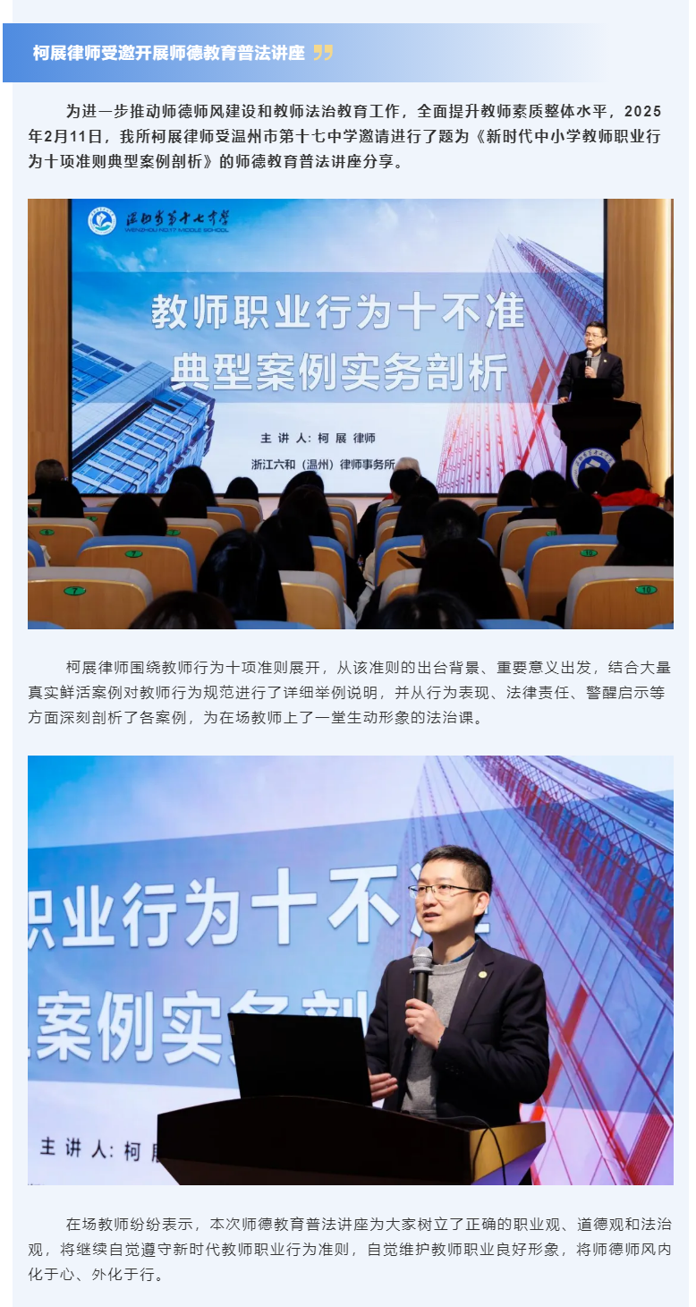 六和温州所柯展律师受邀为温州市第十七中学开展新学期师德教育普法讲座
