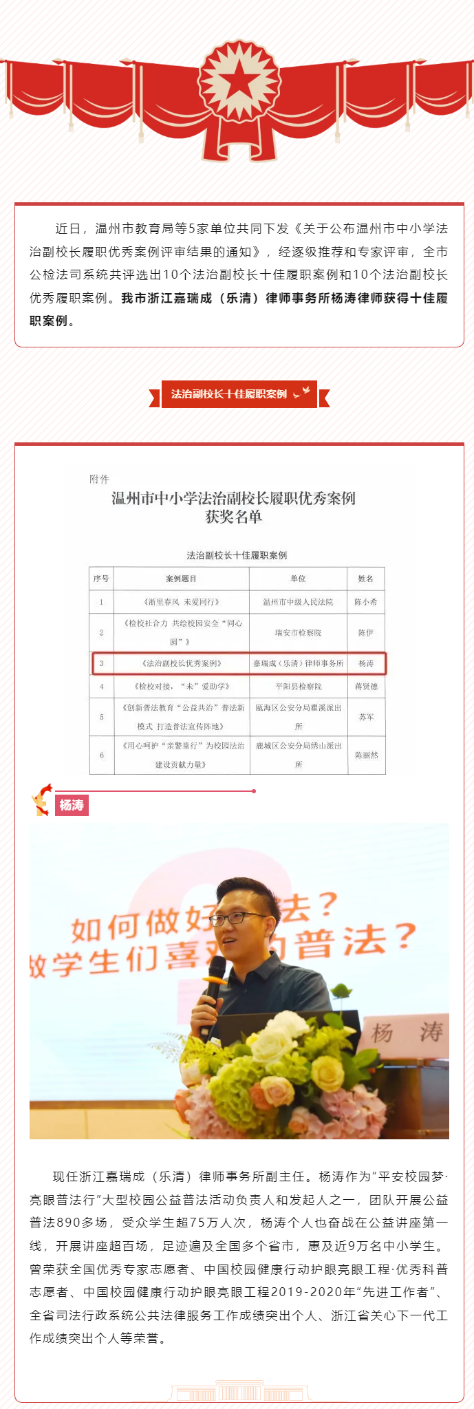 法育青蓝润新芽 | 嘉瑞成乐清所杨涛律师获全市中小学法治副校长履职十佳案例