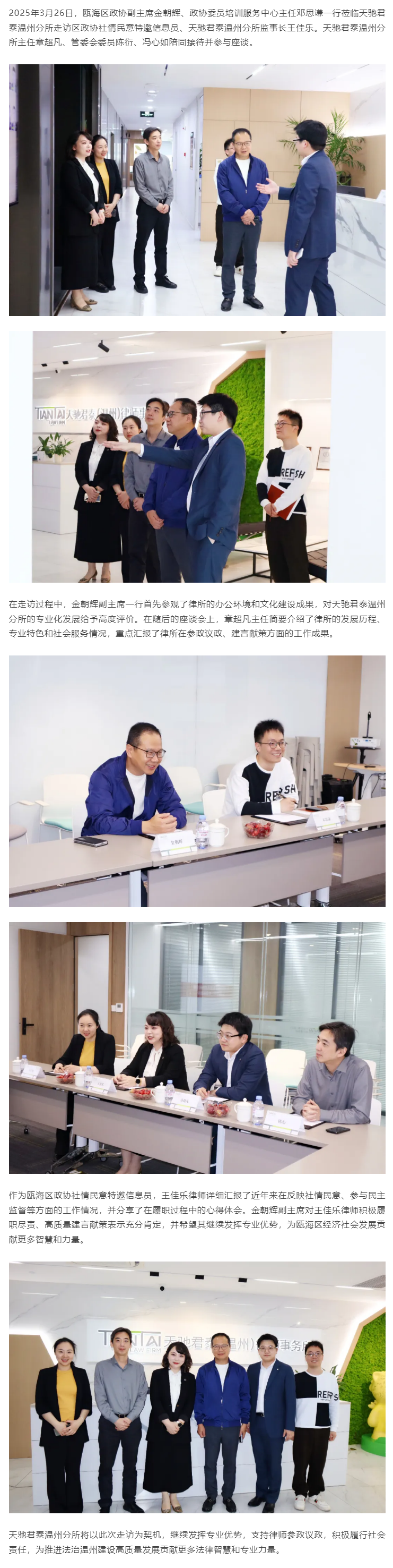 瓯海区政协副主席金朝辉一行莅临天驰君泰温州所走访区政协社情民意特邀信息员
