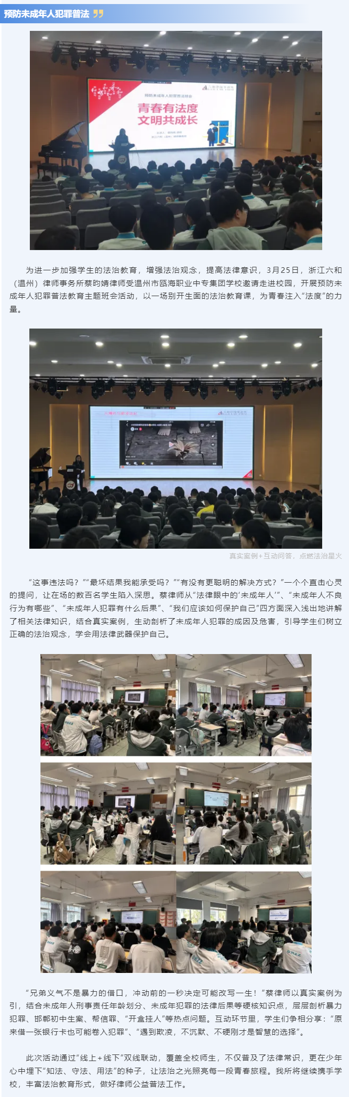 六和温州所蔡昀婧律师受邀赴温州市瓯海职业中专集团学校开展预防未成年人犯罪普法教育活动