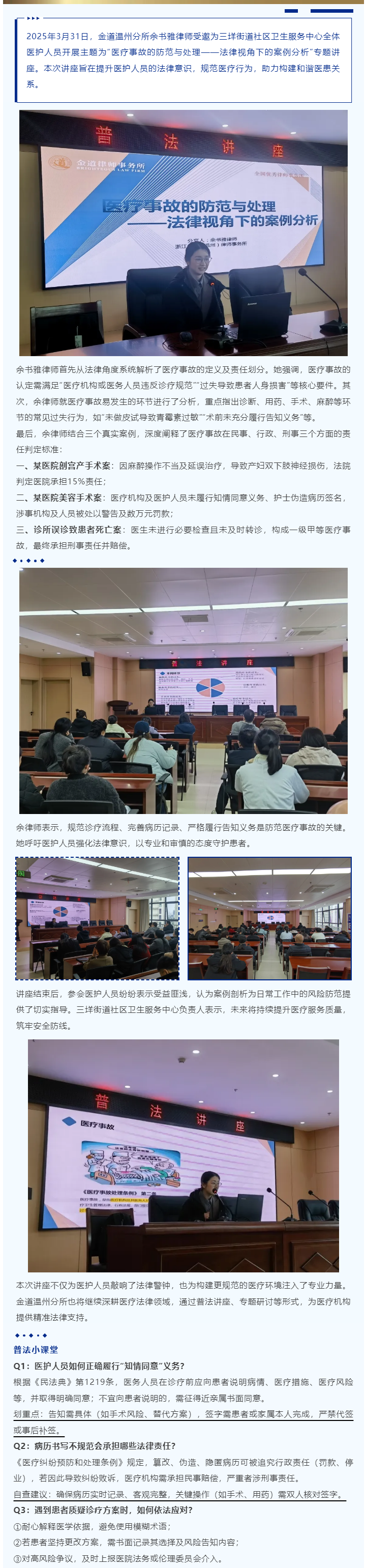 医路同行,法治护航——金道温州所余书雅律师为三垟街道医护人员开展医疗事故风险防控讲座