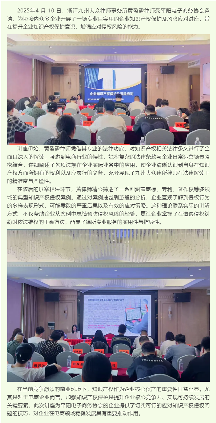 九州大众所黄盈盈律师受邀为平阳电子商务协会开展企业知识产权保护专题培训