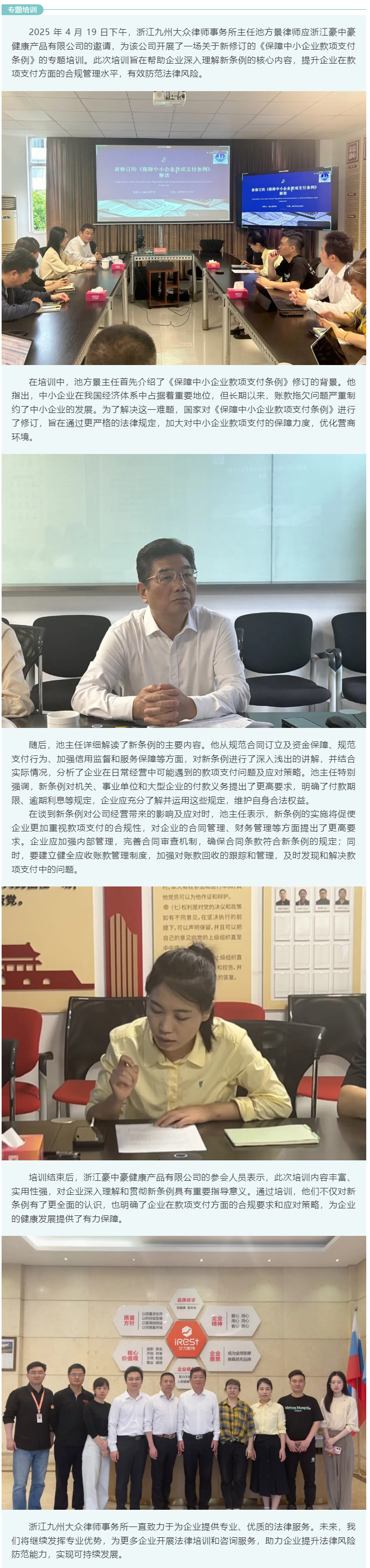 九州大众所池方景主任受邀为浙江豪中豪健康产品有限公司开展《保障中小企业款项支付条例》专题培训