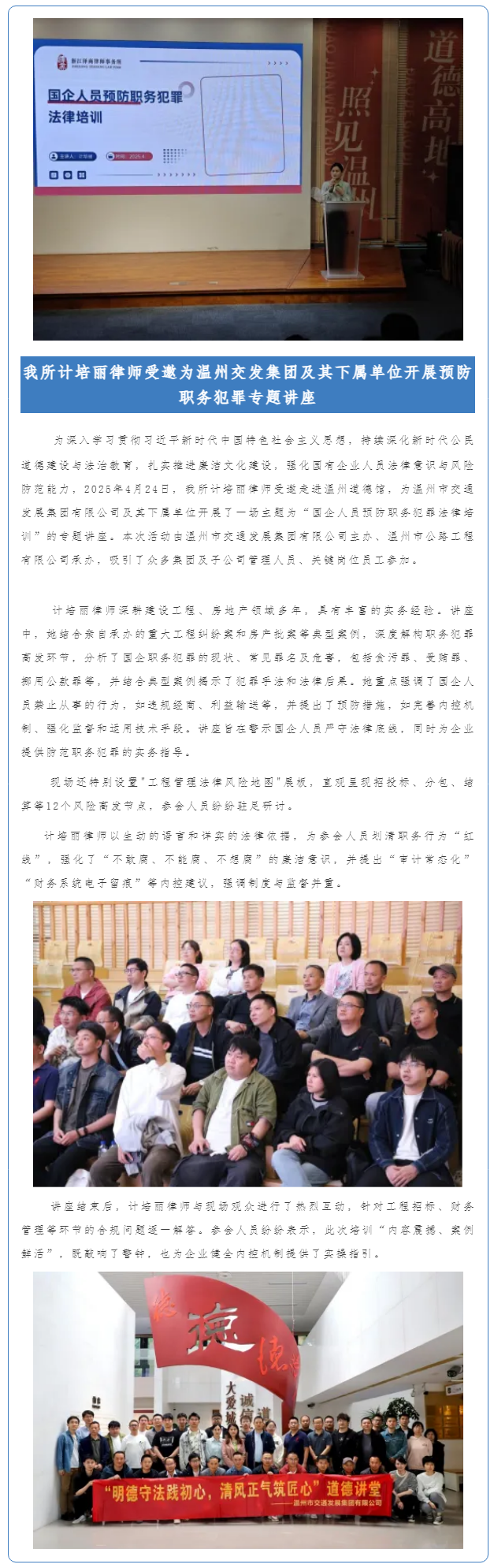 泽商所计培丽律师受邀为温州交发集团及其下属单位开展预防职务犯罪专题讲座