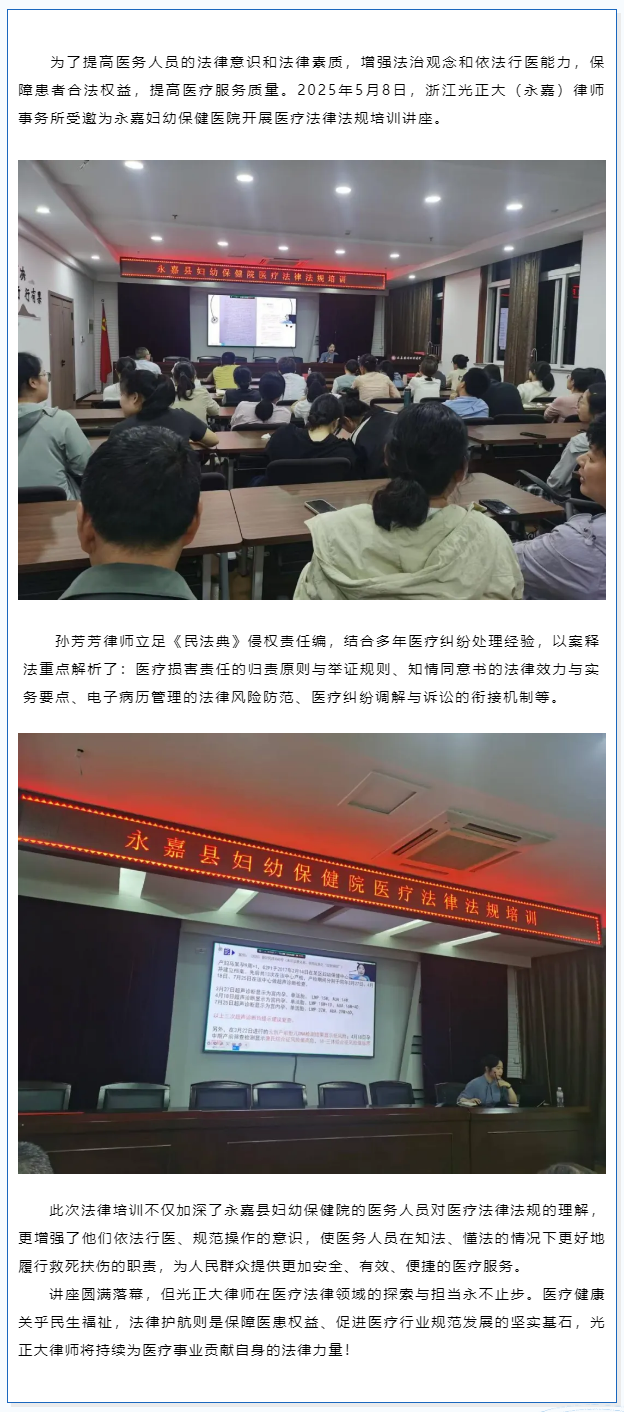光正大永嘉所孙芳芳律师受邀为“永嘉县妇幼保健院”开展医疗法律法规培训讲座