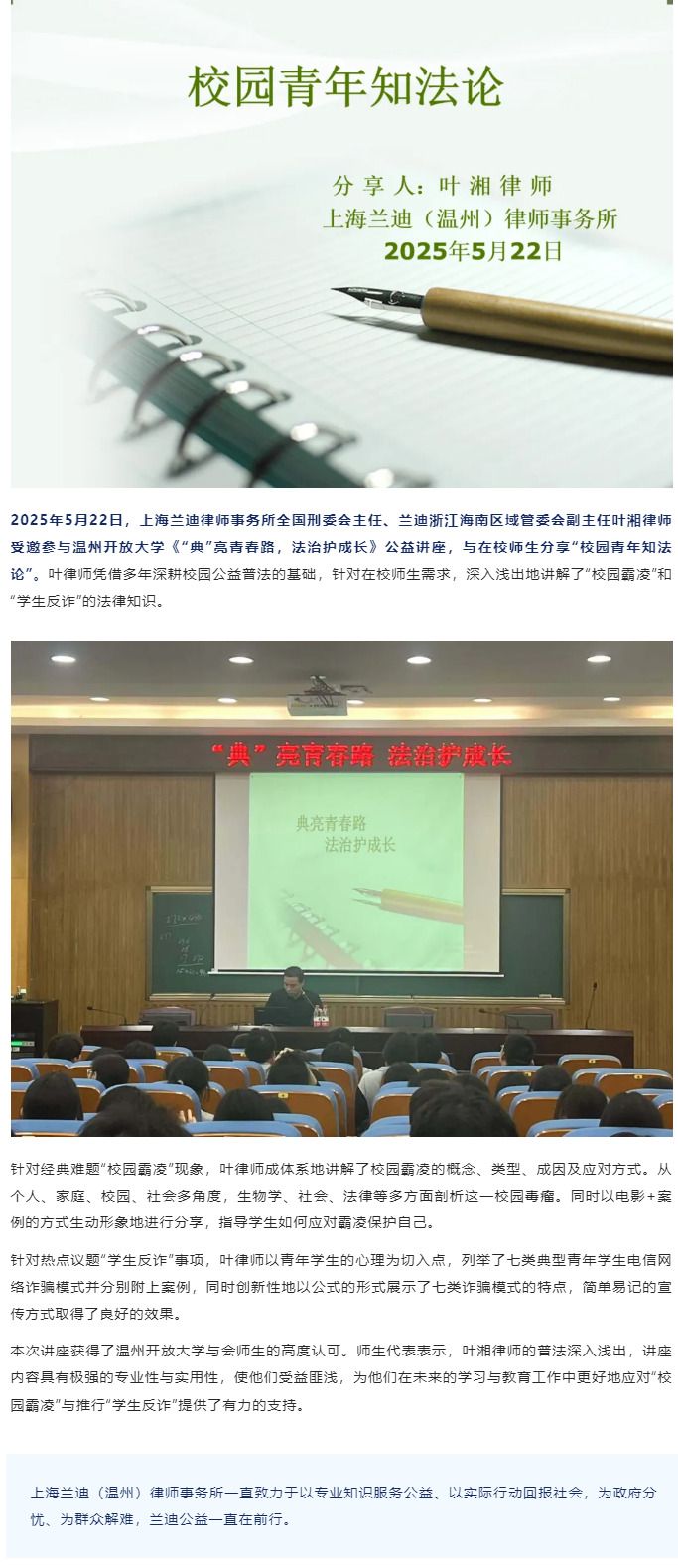 兰迪温州所叶湘律师受邀参与温州开放大学《“典”亮青春路,法治护成长》公益讲座