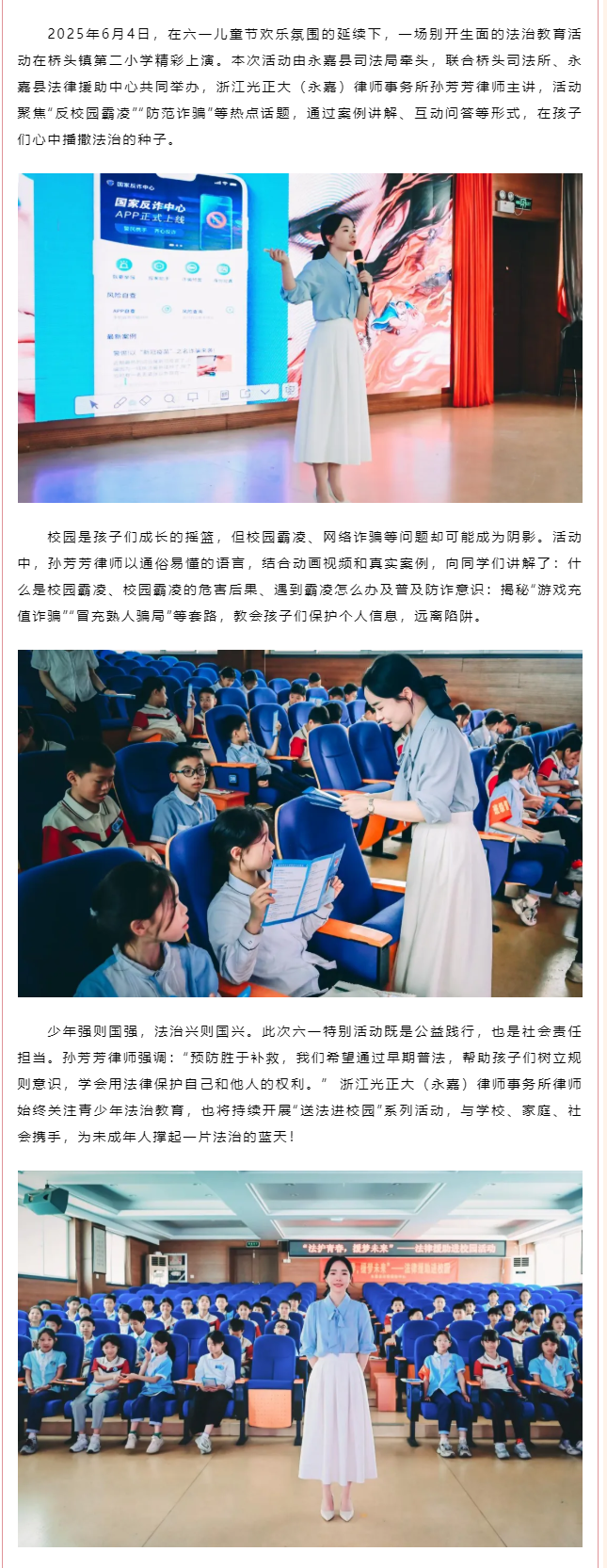 光正大律师永嘉分所孙芳芳为桥头镇第二小学开展青少年普法讲座