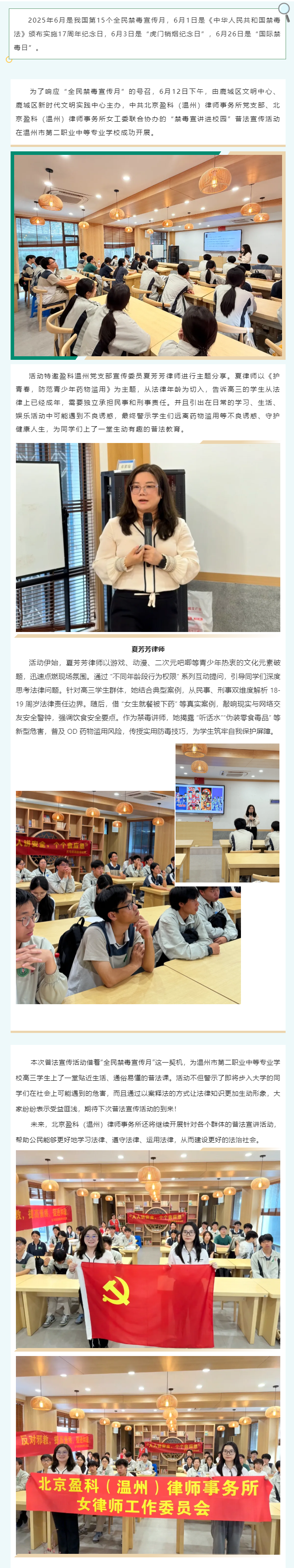 盈科温州所夏芳芳律师受邀为温州市第二职业中等专业学校进行“禁毒宣讲进校园”普法宣传活动