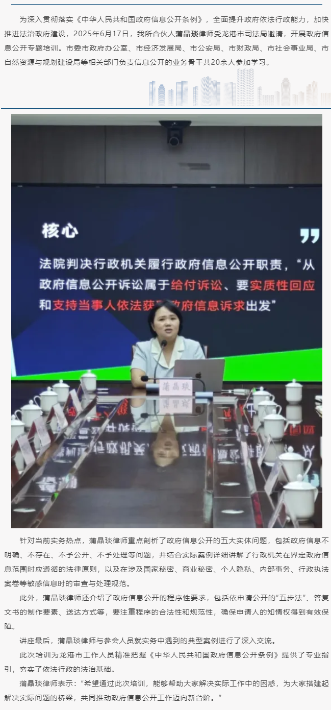震瓯所蒲晶琰律师受龙港市司法局邀请开展政府信息公开专题培训