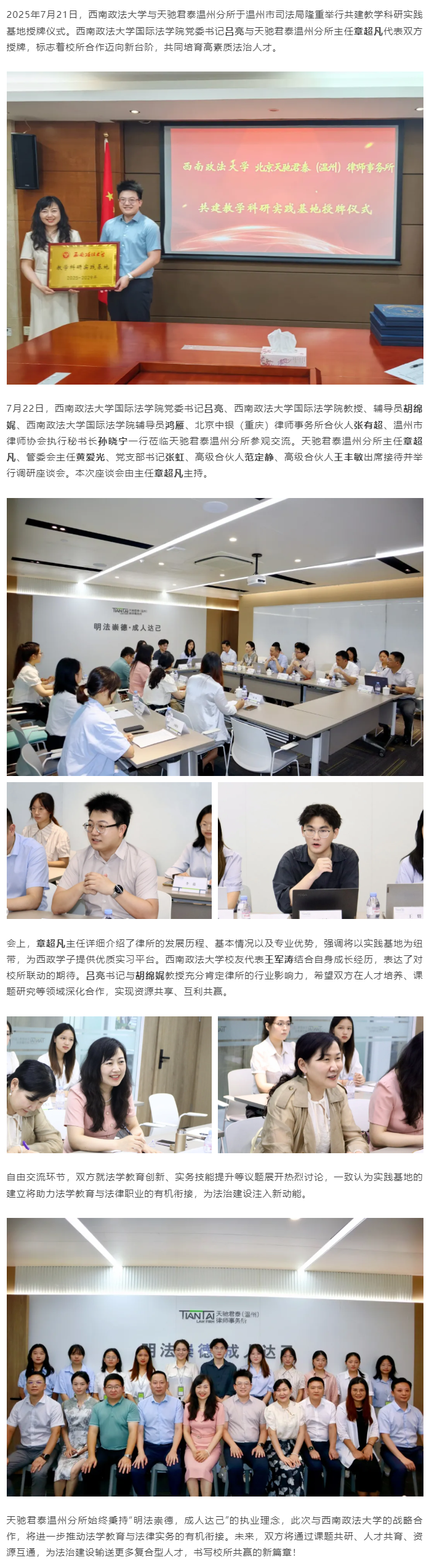 西南政法大学领导莅临天驰君泰温州分所调研交流 共探实践教学基地创新发展之路