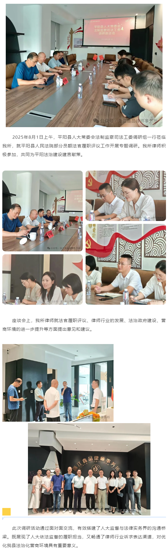 平阳县人大常委会法制监察司法工委主任黄朝勇一行莅临鑫品所开展员额法官履职评议调研座谈会