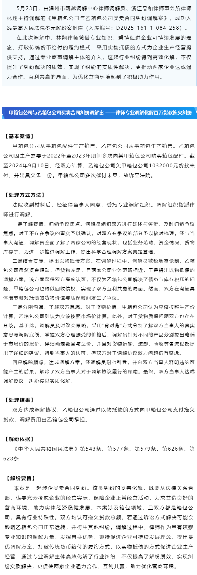温州市瓯越调解中心案例入选最高人民法院多元解纷案例库