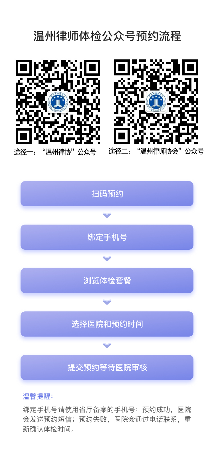 市律师协会统一组织的体检时间为9月5日至11月30日。鹿城、龙湾、瓯海、洞头四个区,以及报名参加市律协体检的县(市)的律师请通过以下途径进行体检预约: