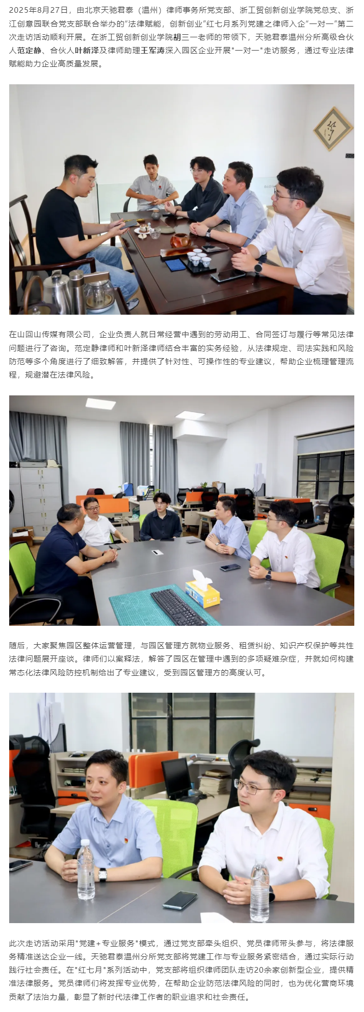 天驰君泰温州分所党支部与浙工贸创新创业学院党总支等联合开展"红七月"律师入企"一对一"第二次走访活动