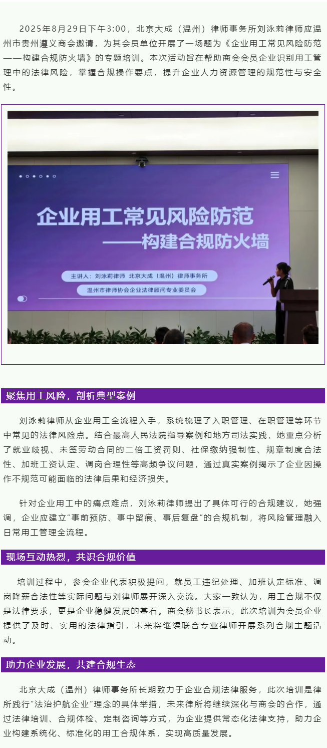 北京大成(温州)律师事务所受邀为温州市遵义商会开展企业用工培训