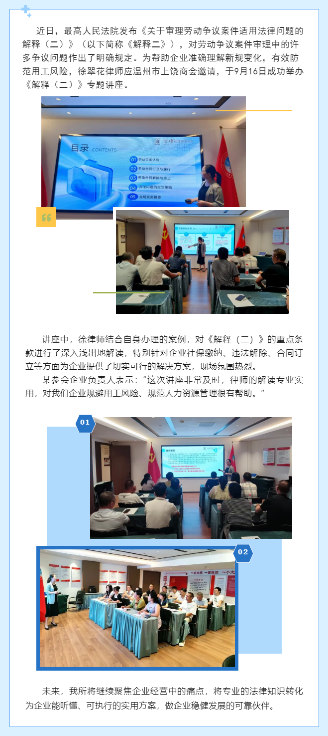 聚祺所徐翠花律师受邀为温州市上饶商会会员企业开展《劳动争议司法解释(二)》专题讲座