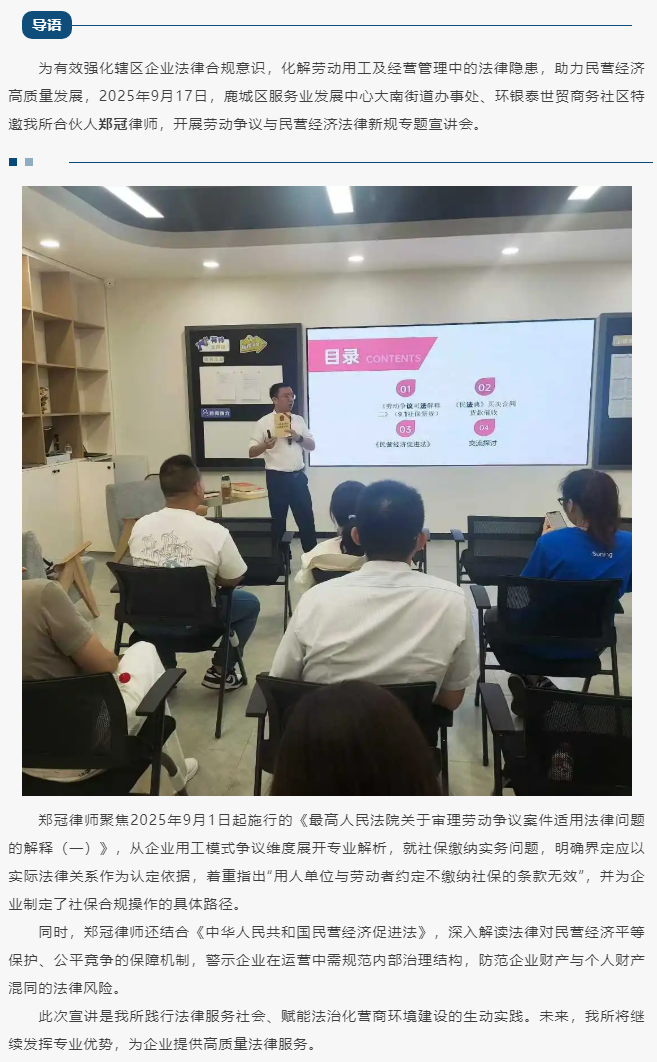 震瓯所合伙人郑冠律师开展劳动争议与民营经济法律新规专题宣讲会