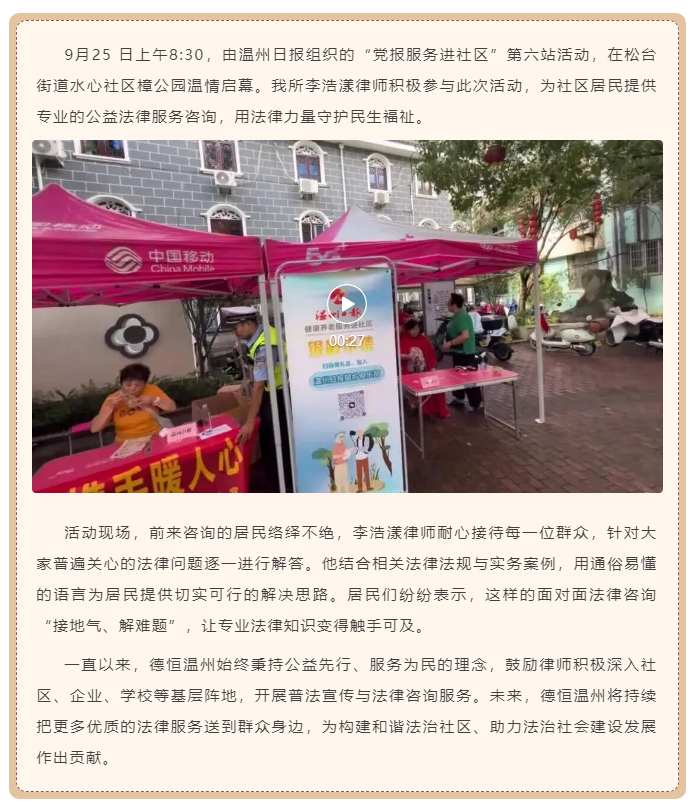 法律咨询服务送上门!德恒温州所李浩漾律师走进水心社区,公益普法暖民心