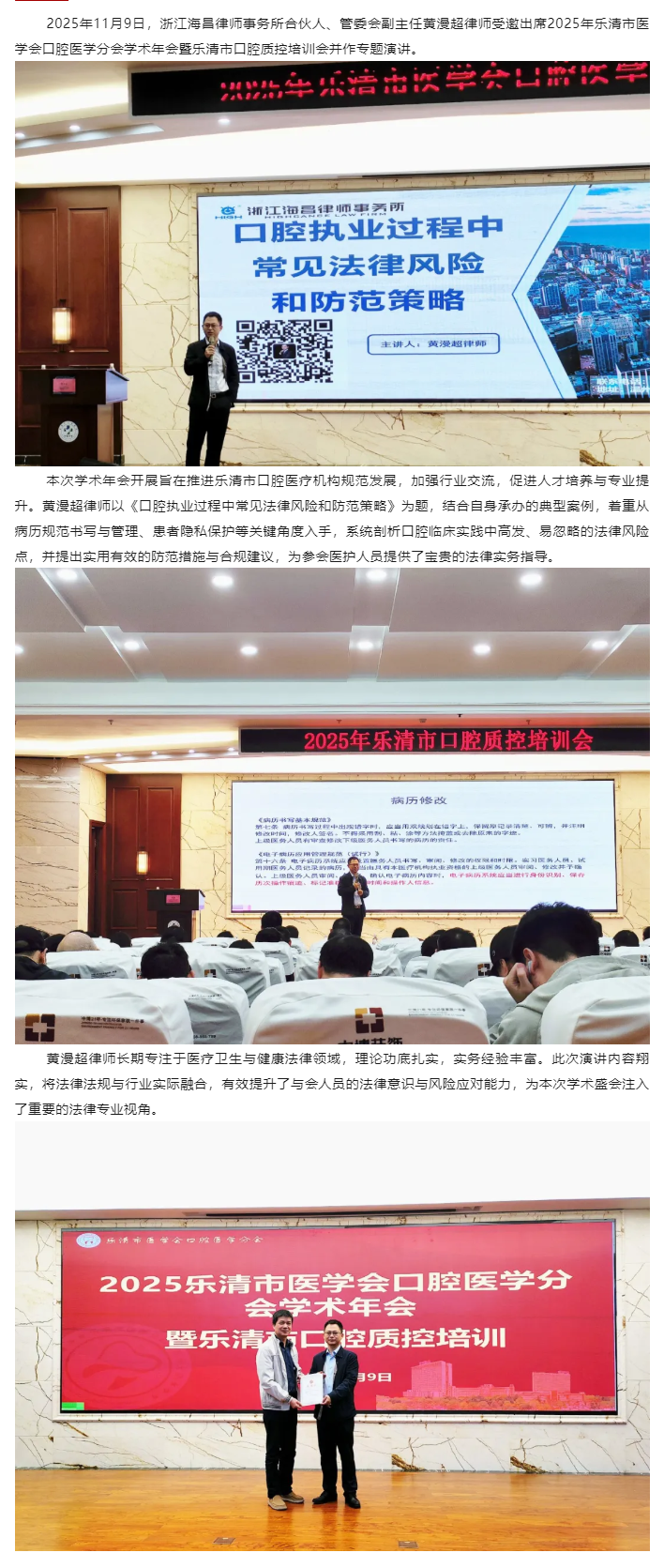 海昌所合伙人黄漫超律师受邀出席乐清市口腔医学年会并作专题演讲