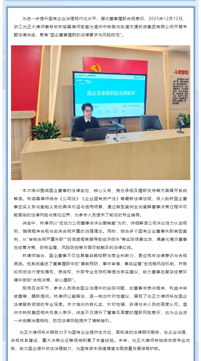 光正大所林斌晶律师为温州市铁路与轨道交通投资集团有限公司开展专题培训
