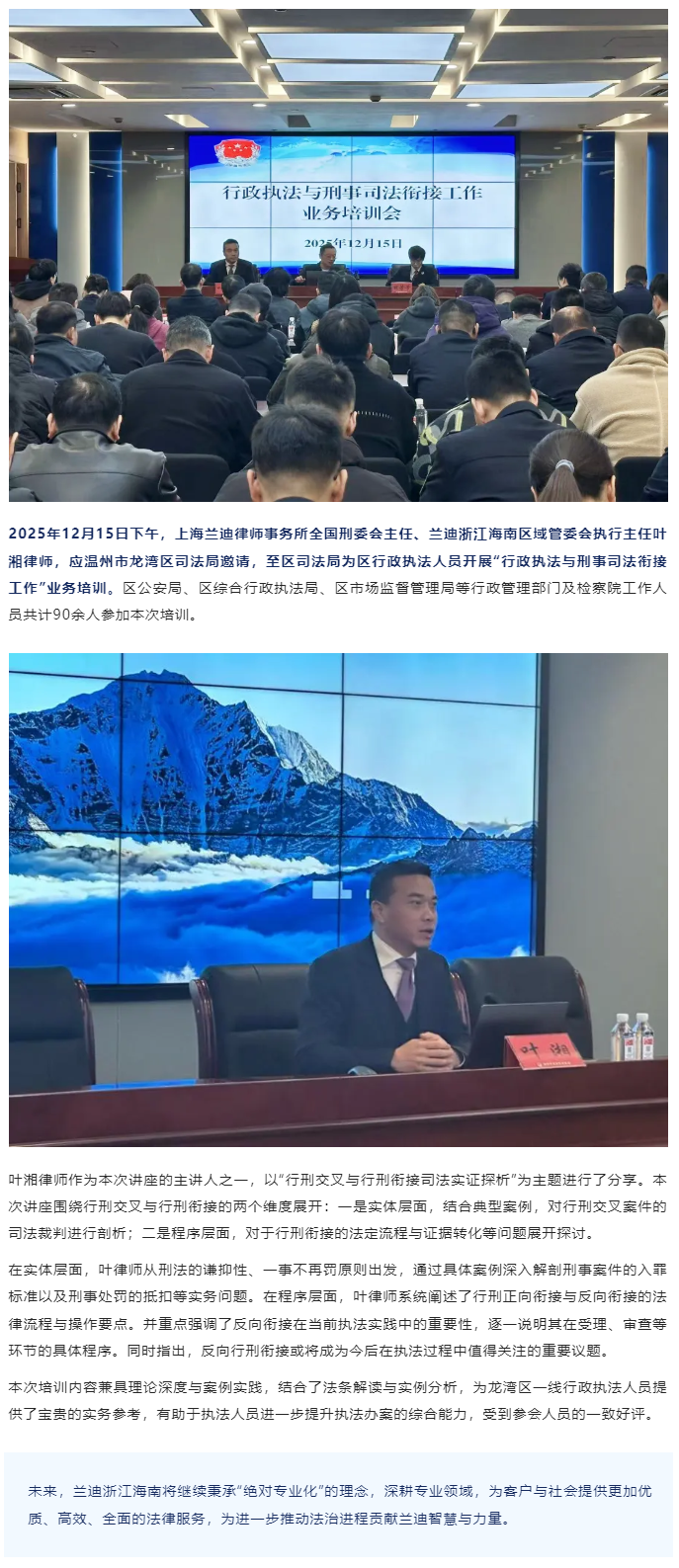 兰迪温州所叶湘律师受邀为龙湾区司法局开展“行政执法与刑事司法衔接工作”业务培训