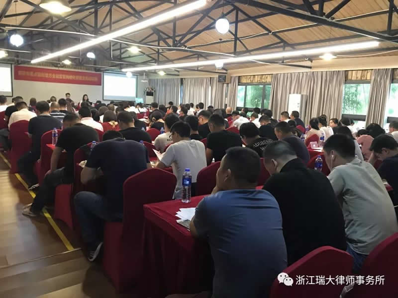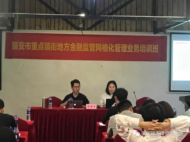 6月4日,浙江瑞大律师事务所杨建崇律师受邀在瑞安市高楼五谷小镇为瑞安市重点镇街地方金融监管网格工作人员举行了主题为“民间金融法律风险及其防范”普法培训授课。