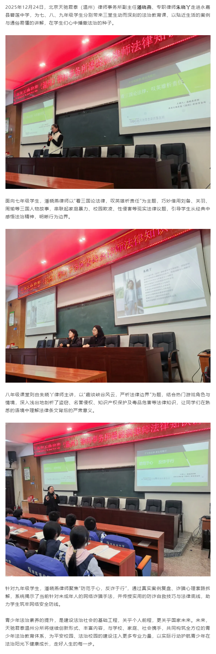 千所万律公益行 | 天驰君泰温州分所律师走进永嘉县碧莲中学开展系列普法课堂