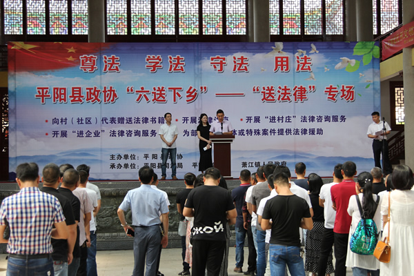 6月15日,平阳县司法局联合县政协、萧江镇政府等单位,开展“送法律下乡”大型服务活动,萧江镇村(社区)干部、村(社区)网格员、调解员等近200人参与启动仪式。县政协副主席吴洁、县司法局政治处主任林立华、萧江镇委副书记梅川排出席活动。活动分成五项主题: