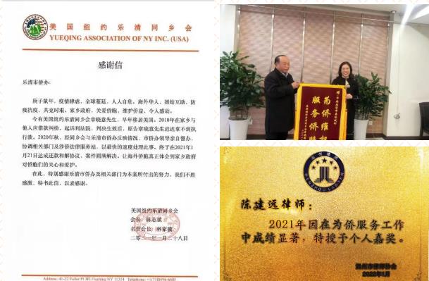 近几年,乐清市侨务部门立足市情侨情,不断推进法律援助护侨工程,用心用情用力解决侨界群众“急难愁盼”问题,把群众的事办实办好,让侨界群众感受到党和政府的温暖。2021,乐清市侨务部门受理涉侨法律咨询380余件,开展送法进企活动10场次,妥善解决涉侨案件42件,赢得了社会各界的一致好评。