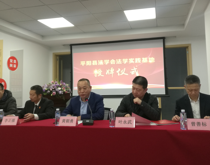 近日,平阳县首个法学实践基地——平阳县法学会法学实践基地在浙江九州大众律师事务所正式设立,县委政法委副书记黄朝勇,县法学会副会长、县公安局政委叶永武,县法学会副会长、县法院常务副院长李正强,县司法局副局长曾善标,县法学会副会长陈杰出席授牌仪式。