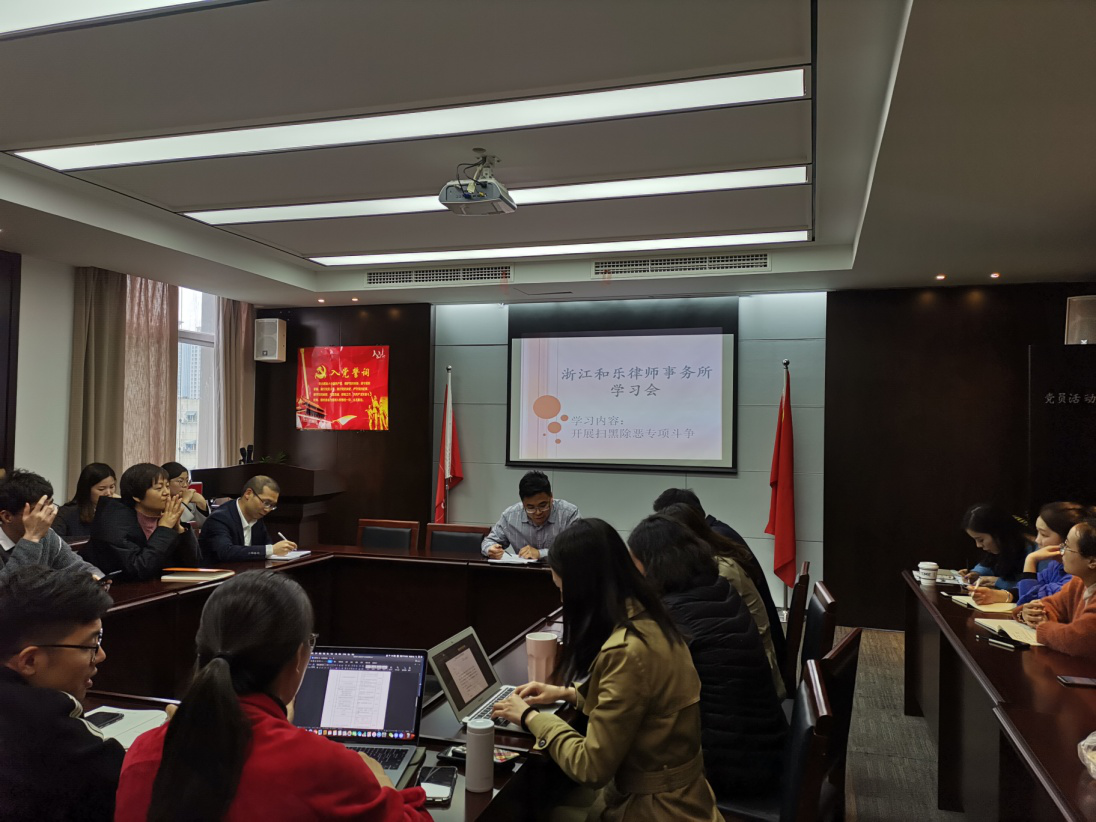 4月11日下午,浙江和乐律师事务所在会议室开展扫黑除恶专项斗争学习会。会议由和乐所管委会副主任王衍律师主持,律师事务所全体同仁参加会议。
