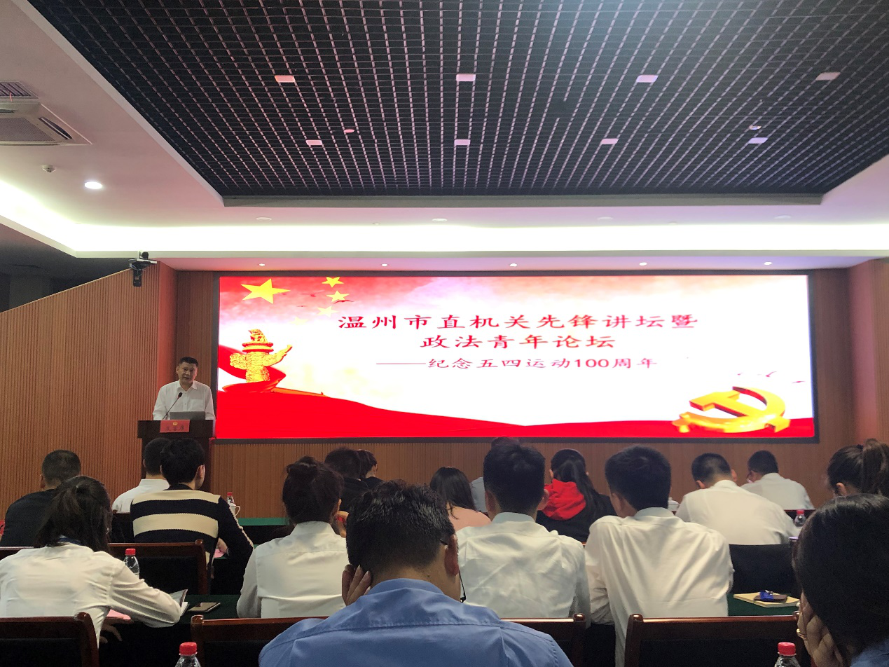 为纪念五四运动100周年,增强青年的历史责任感和时代使命感,推动新时代法治温州建设更上新台阶,5月6日下午,以“法治保障温州‘两区’建设”为主题的温州市直机关先锋讲坛暨青年政法论坛在温州市中级人民法院召开。全市近100余位青年代表参加本次活动,其中,市司法行政系统共有10位青年代表参加。