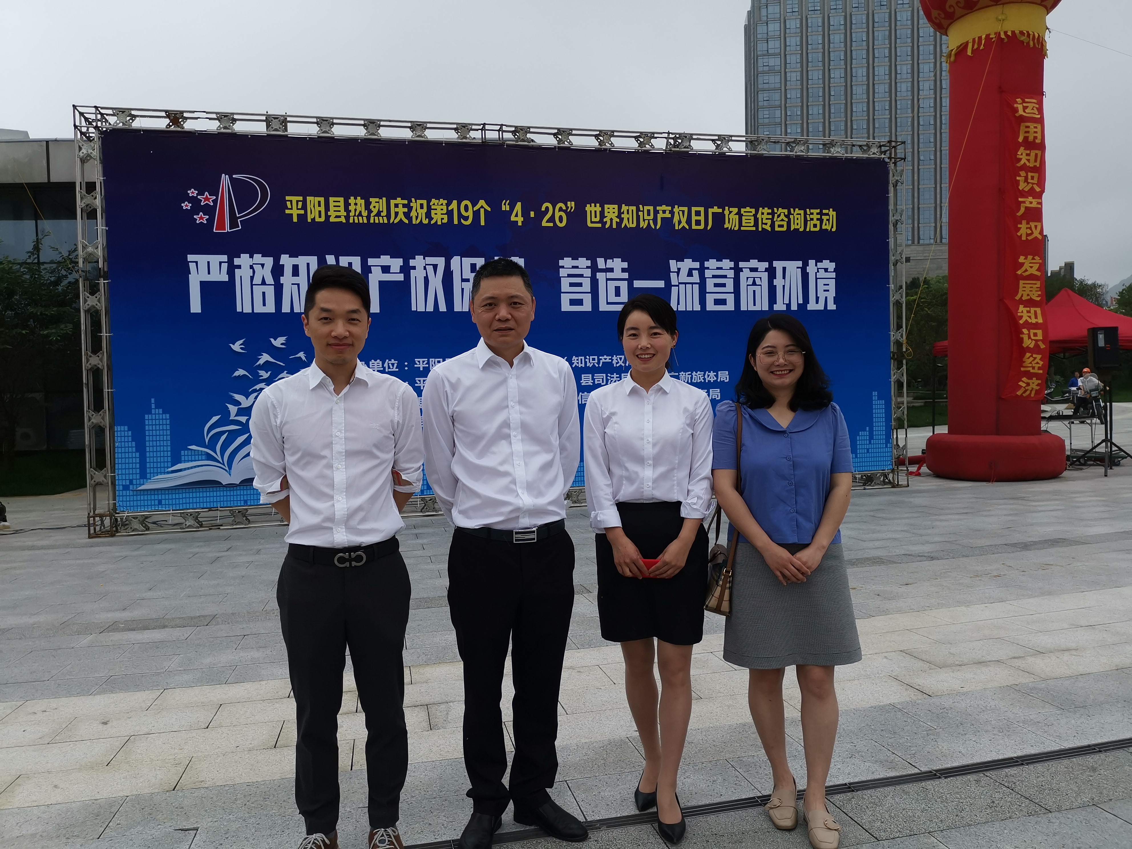 为进一步普及知识产权教育知识,提高全社会的知识产权意识,营造“尊重知识、崇尚创新、诚信守法”为核心理念的社会氛围。在4月26日、第19个世界知识产权日当天,平阳县司法局联合县市场监管局、县检察院等部门单位在凤湖公园广场开展“严格知识产权保护 营造一流营商环境”宣传活动,同时邀请浙江九州大众律师事务所知识产权法律服务团队为群众提供现场法律咨询服务。