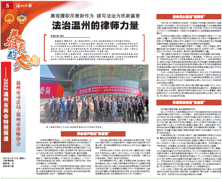 新一届温州律师人大代表、政协委员亮相2022 年的温州市两会。