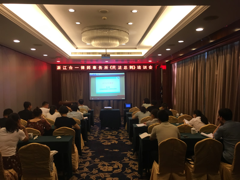 2017年8月19日,浙江合一律师事务所组织全所律师参加《民法总则解读》视频讲座。 这次讲座为期1天,由资深专家主讲,详细讲解了民法总则的立法背景,主要特点,重点法条解读。通过此次集中大学习,带动了全所律师学习《民法总则》的积极性,确保律师业务知识及时更新,对全所律师深刻理解和掌握新修改的《民法总则》、精准提供法律服务具有重要的促进作用,有效强化了全所律师的办案能力。