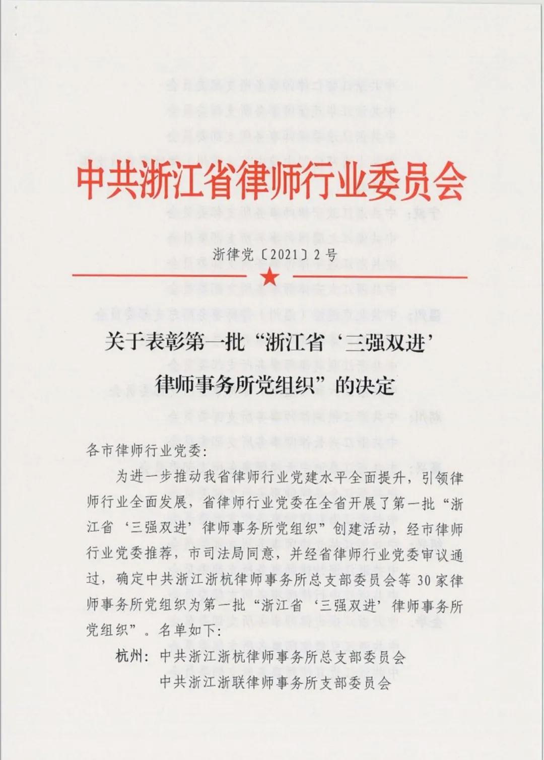 1月18日,浙江省律师行业党委发布了《关于表彰第一批“浙江省 ‘三强双进’律师事务所党组织”的决定》,对全省30家律师事务所党组织进行表彰。其中,我市中共北京德恒(温州)律师事务所总支部委员会、中共浙江嘉瑞成律师事务所总支部委员会、中共浙江联英律师事务所支部委员会、中共浙江六和(温州)律师事务所支部委员会获第一批“浙江省 ‘三强双进’律师事务所党组织”。
