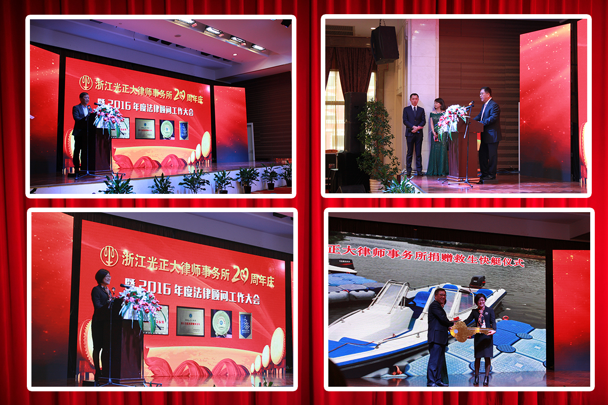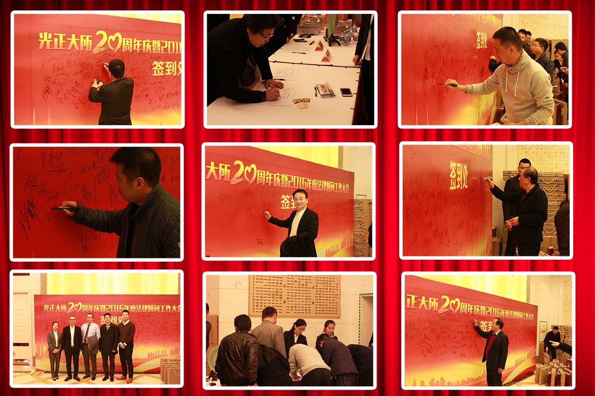 2016年是光正大所成立20周年。为使光正大所20周年庆典活动既简朴又具有承前启后的重要意义,12月18日,光正大所特结合2016年度法律顾问工作会议在王朝大酒店举办庆典活动。市司法局副局长、市律协党委书记朱进龙,市红十字会党组书记、常务副会长陈晓甜,市司法局律管处处长、市律协秘书长袁旭清,区司法局局长张维忠,区司法局副局长陈苾怀,温州市律师协会副秘书长孙晓宁,区司法局法管科长胡笑华以及光正大所法律顾问单位近300余人出席活动。