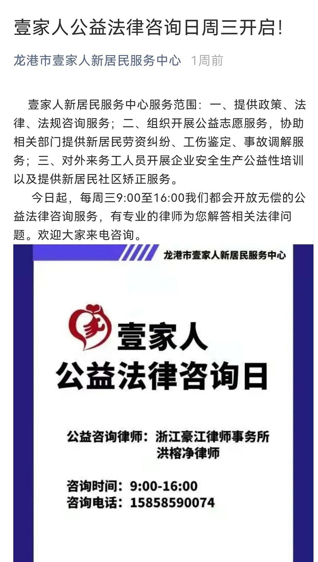 豪江律师事务所律师组成公益普法团,每周三9点至16点定期在新居民服务中心免费为群众提供法律咨询。