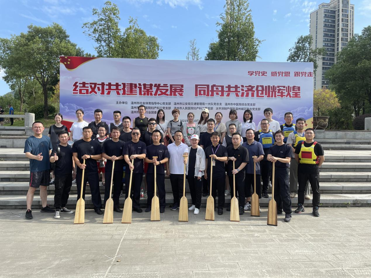 2021年9月10日,由温州市社会体育指导中心党支部、温州市公安局交通管理局一大队党总部、温州市人民医院二、三党支部、太平洋财产保险温州城区联合党支部、温州市律师行业团委等联合主办的“结对共建谋发展 同舟共济创辉煌”党团共建活动在温州市龙舟基地顺利举行。