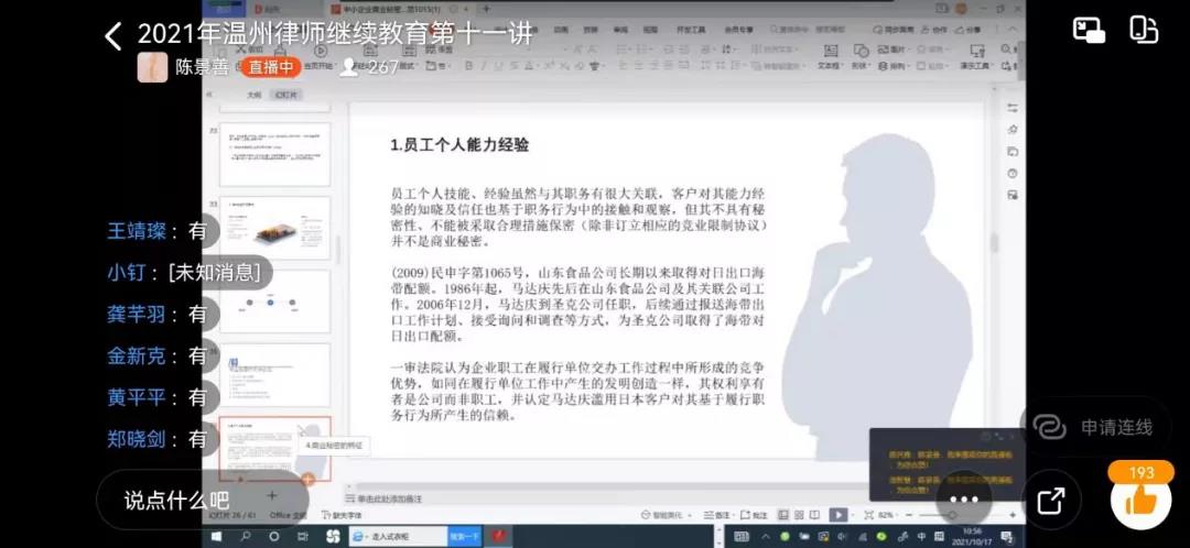 2021年10月17日上午,温州律协商(协)会法律事务(法律顾问)专业委员会举办2021年温州律师继续教育第十一讲——“中小企业商业秘密和竞业限制风险防范”线上专题讲座,邀请中国政法大学民商经济法学院教授、博士生导师陈景善教授主讲,全市300余名律师参加了本次在线培训。