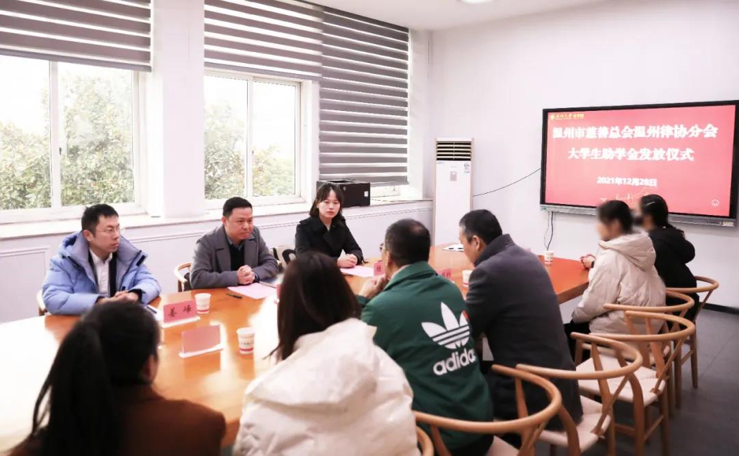 2021年12月28日下午,温州市律师协会副会长姜正等一行前往温州大学法学院开展捐资助学活动。温州大学法学院书记林钦、学院党委副书记杨振海以及受援学生代表参加活动。