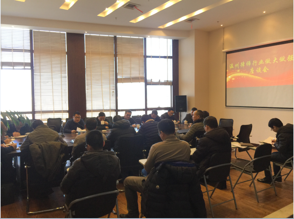 为贯彻落实温州市司法局《关于实施品牌战略做大做强律师业的指导意见》文件精神,推进温州律师业“1350”战略实施,1月25日,市律协邀请部分律师所主任召开律师行业做大做强座谈会。市局副局长、市律协党委书记朱进龙,市律协会长、副会长、党委委员出席了会议,座谈会由市局律管处处长、市律协秘书长袁旭清主持。