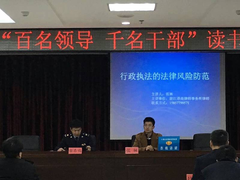 近日,浙江泽商(洞头)律师事务所张林律师受温州市洞头区地税局邀请,在“领导干部百千读书班”上为区地税局执法人员培训行政执法知识,共六十余名行政执法人员聆听讲座。