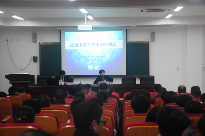 1月21日,浙江玉海律师事务所余心海律师应瑞安市国土资源局邀请,在瑞安城市学院为该局工作人员举办《法治语境下的不动产登记》法律知识讲座。
